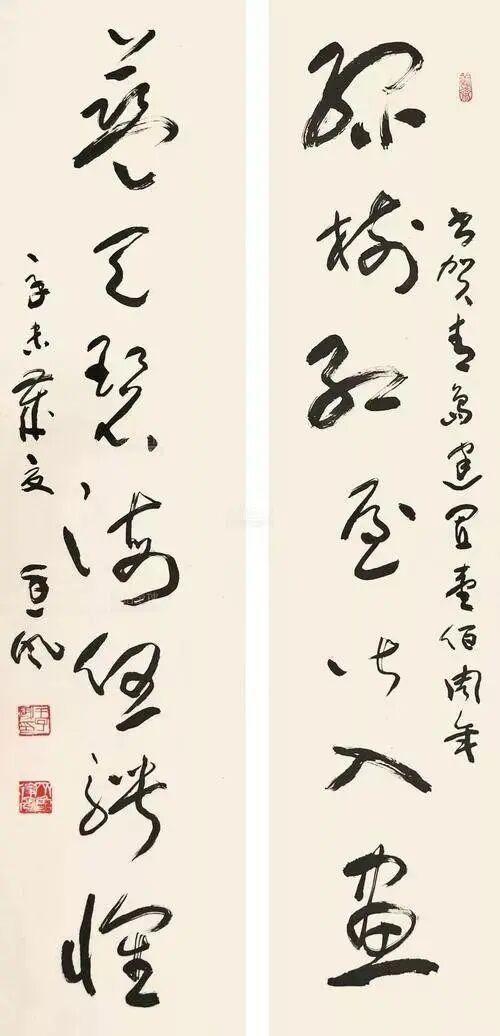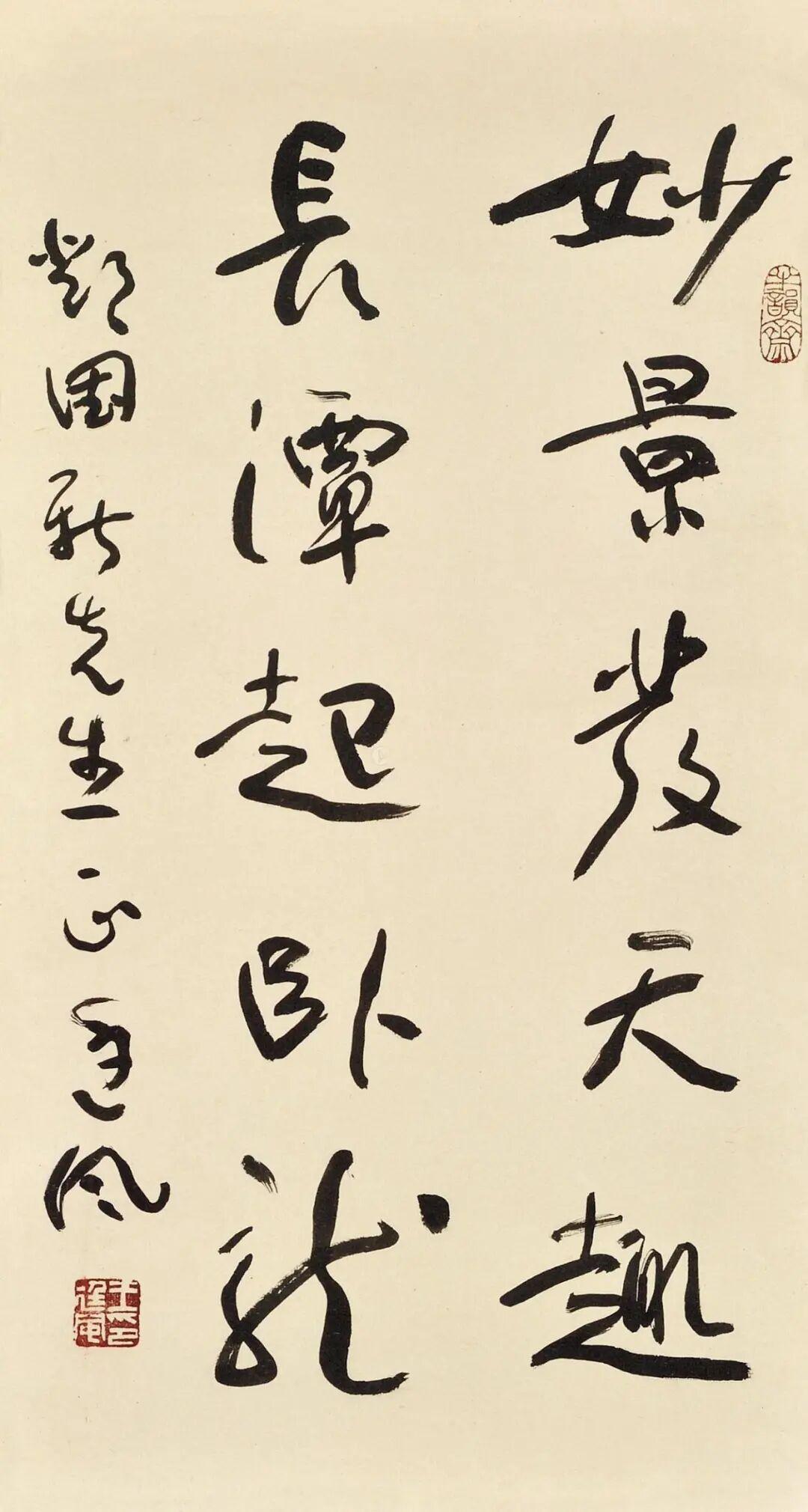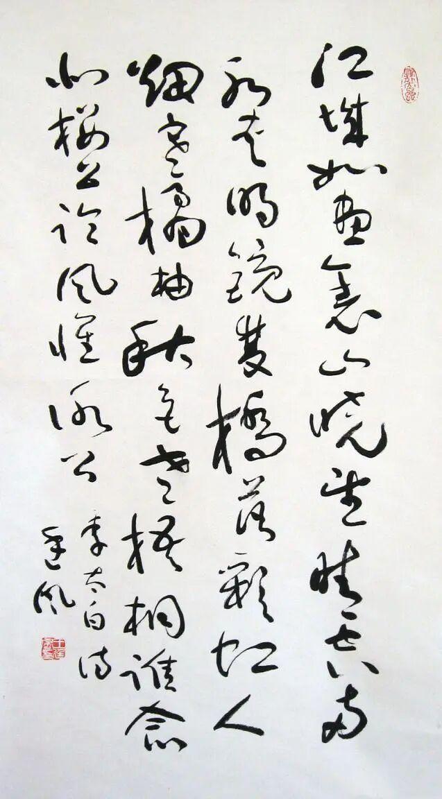 再看王廷风先生的草书,就存在浅易、寡淡无味的缺憾。稀薄是他那些少字数的作品,比如楹联、横批、斗方之类,笔触间似有牵强拉扯之态,仿佛书写者费尽全力,咬牙怒目,却仍有劲不从心的嗅觉,与于右任草书之中充盈弥散的真力比较,出入甚远。王廷风先生还有一些作品,试图交融诸家之长,可一朝偏离于右任书道的立场,便无法作念到神韵完备、声势富足,反而呈现出一种横三顺四、游离不定的景色 。